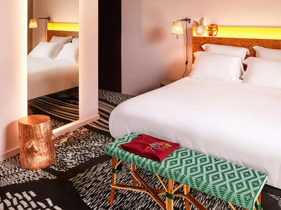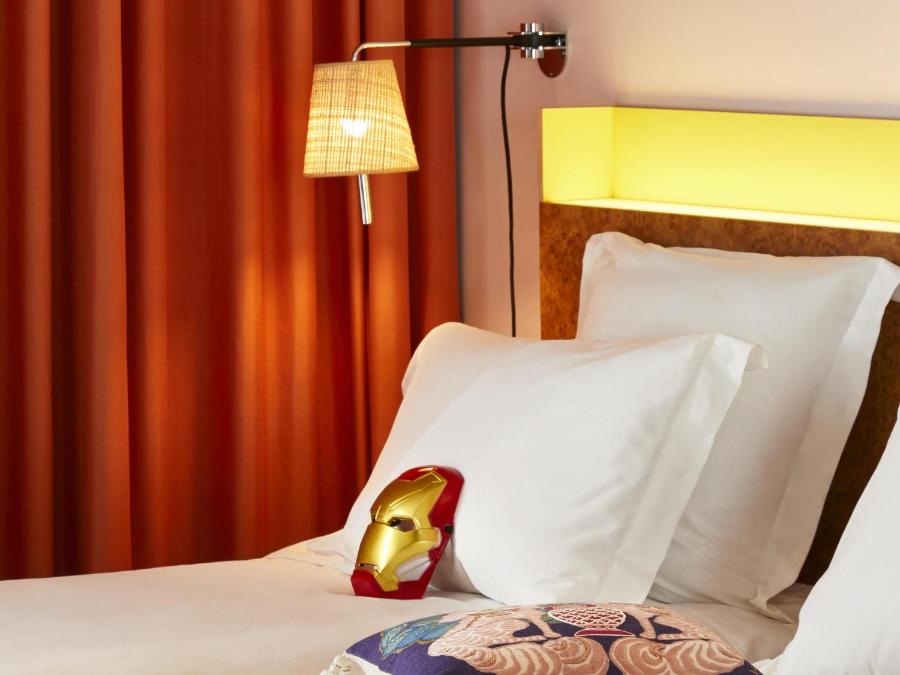 Die Zimmer überraschen durch ihre bewusst gewählte visuelle Identität. Bunte Teppiche, verspielte Dekorationsobjekte, Superheldenmasken auf den Nachttischlampen und eklektische Möbel setzen den Ton. Diese Kreativität beeinträchtigt jedoch nie den Komfort: Das Bett, das Herzstück des Erlebnisses, bietet dank hochwertiger Betten und sorgfältig ausgewählter Kissen eine ausgezeichnete Erholung.